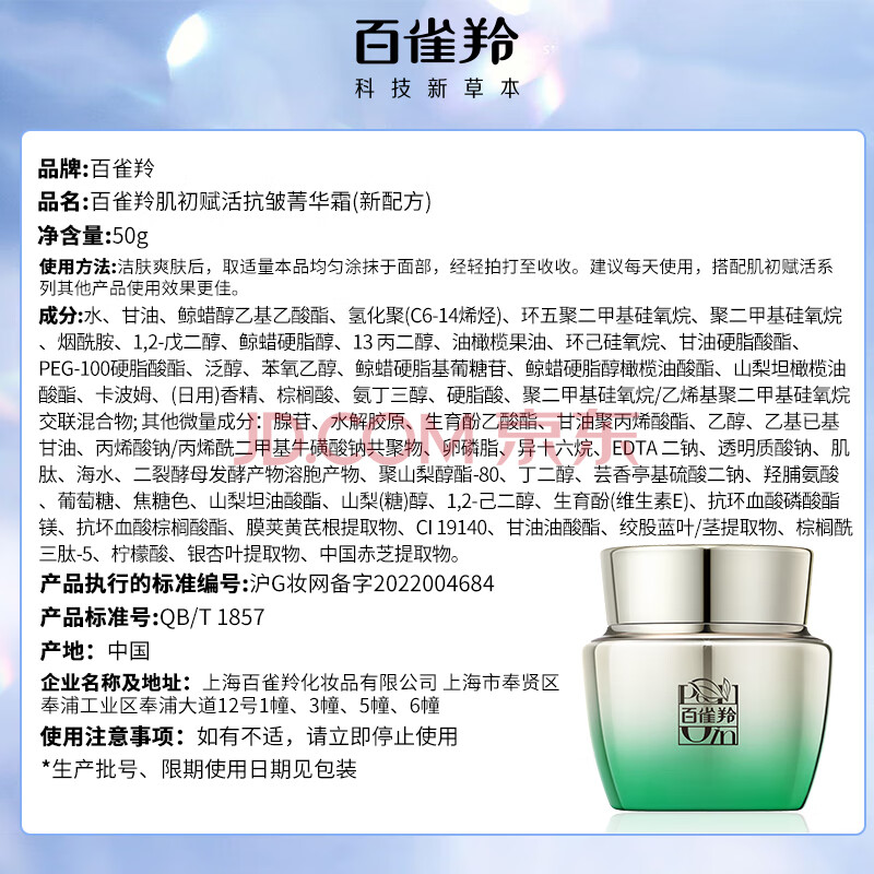 商品相册:百雀羚肌初赋活菁华霜50g护肤抗皱提拉紧致保湿淡纹品质国货生日礼物第