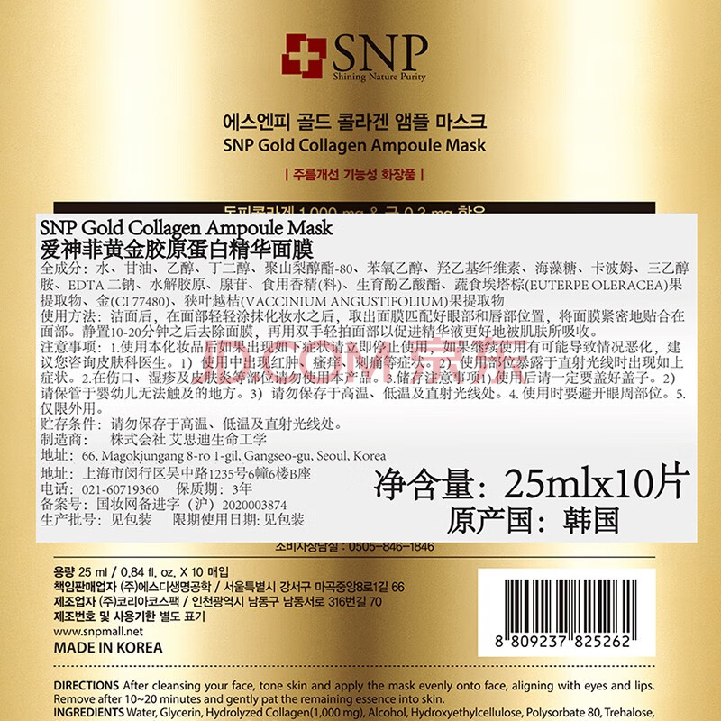 商品相册:SNP黄金胶原蛋白精华面膜25ml*10片 深层保湿 韩国进口 敏肌用 送礼第
