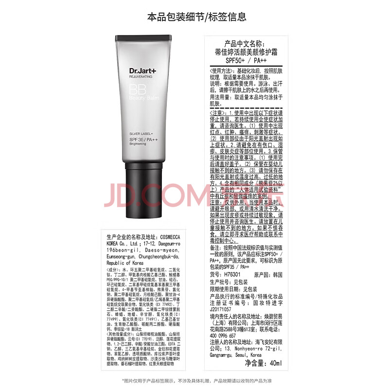 商品相册:蒂佳婷(Dr.Jart)银管BB霜40ml 粉底遮瑕防晒三合一持证美白 保湿提亮 生日礼物第