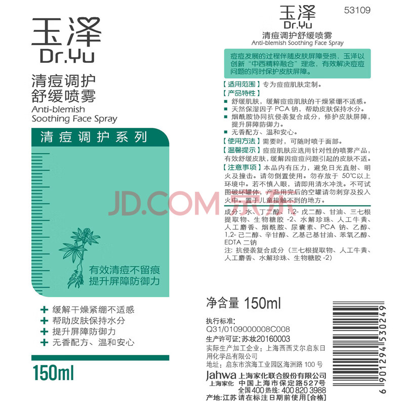 商品相册:玉泽(Dr.Yu)清痘调护舒缓喷雾150ml(含烟酰胺平衡油脂清爽控油)第