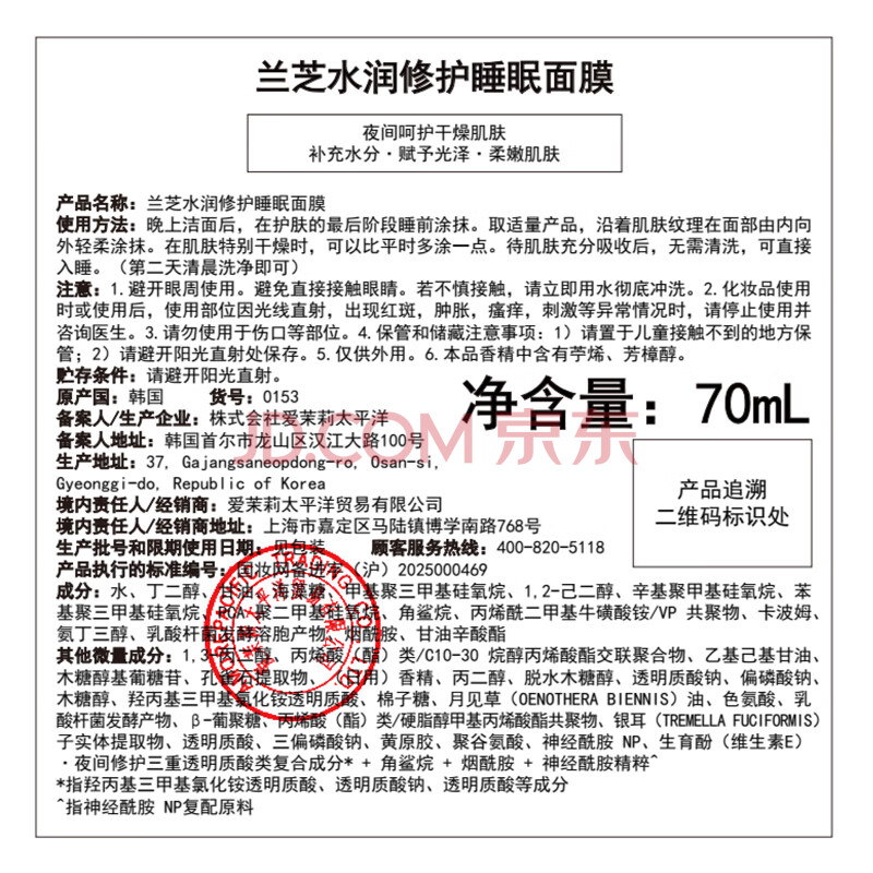 商品相册:兰芝水润睡眠面膜70ml保湿修护舒缓免洗涂抹面膜护肤生日礼物送女友第