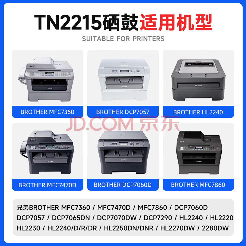 商品相册:天色适用兄弟mfc7360硒鼓dcp7057粉盒7470d hl2240 2130 7060d 7860 fax2890打印机墨盒tn2225/dr2250/tn2215第