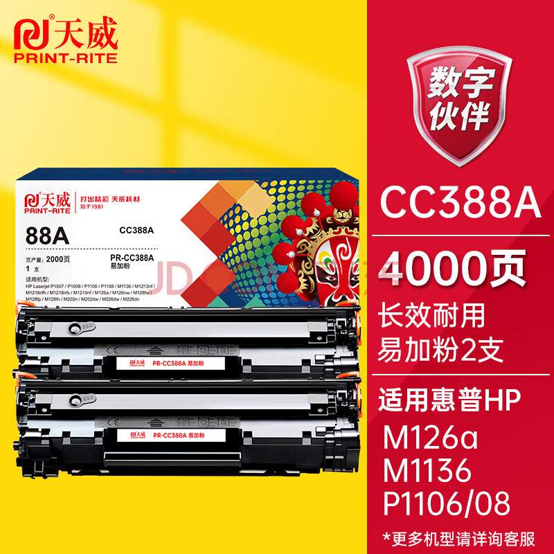 商品相册:天威CC388A硒鼓 M126a硒鼓易加粉2支装 适用惠普HP P1108 P1007 P1106 M1136 M1216nfh M202n M126打印机墨盒第