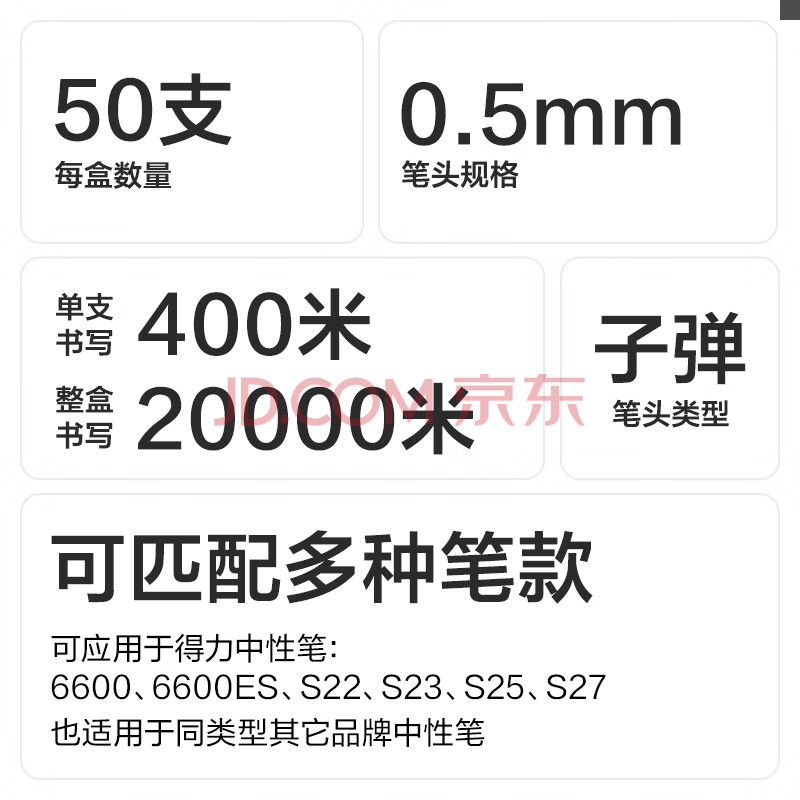 商品相册:得力(deli)量贩装0.5mm黑色子弹头拔帽中性笔芯 学生中性笔签字笔替芯 34567/6600/Q7适用 50支/桶33405 第1张/共5
