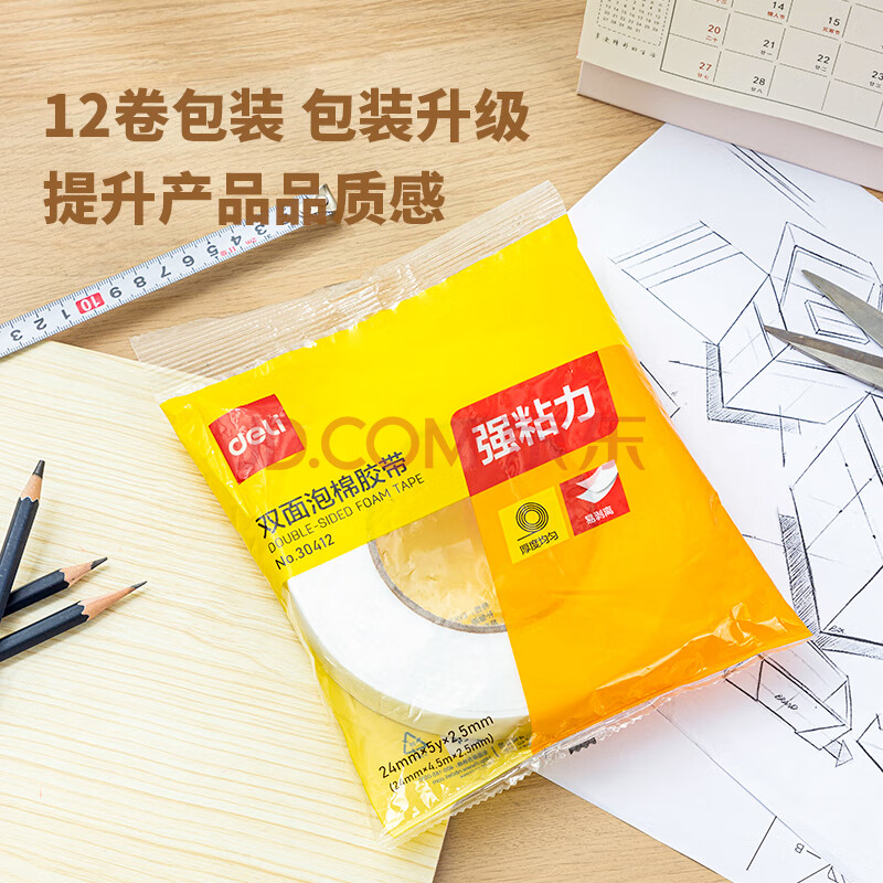 商品相册:得力(deli)高粘EVA泡棉双面胶带 泡沫双面胶强力胶 24mm*5y*2.5mm加厚 白色12卷袋装 办公用品 30412第