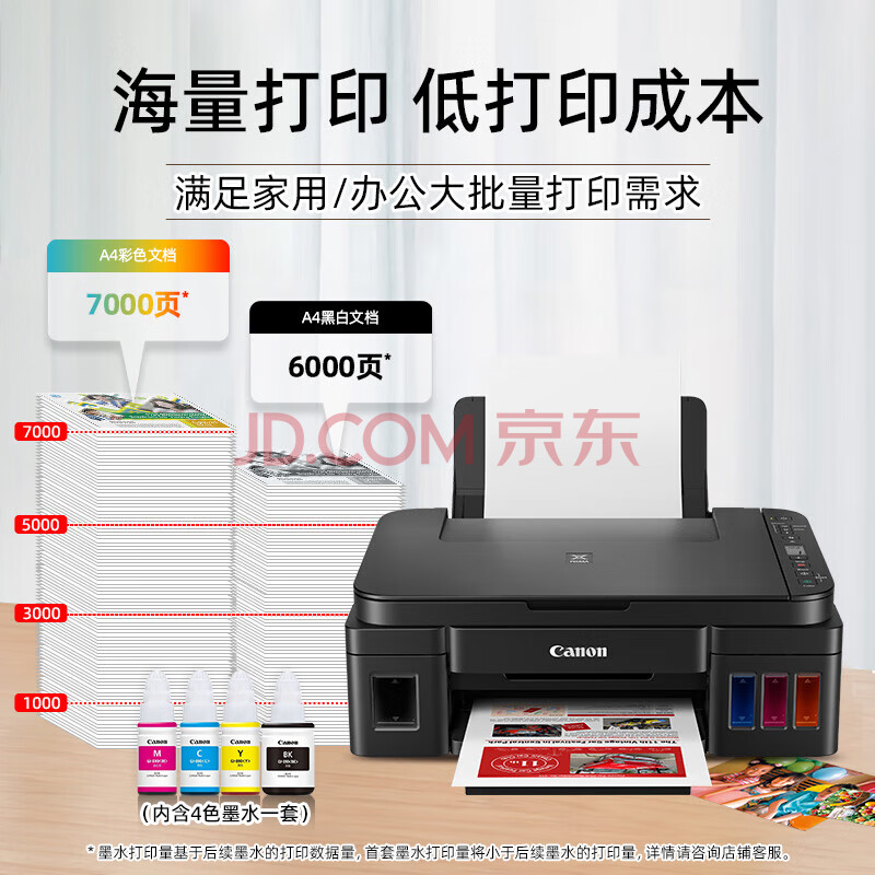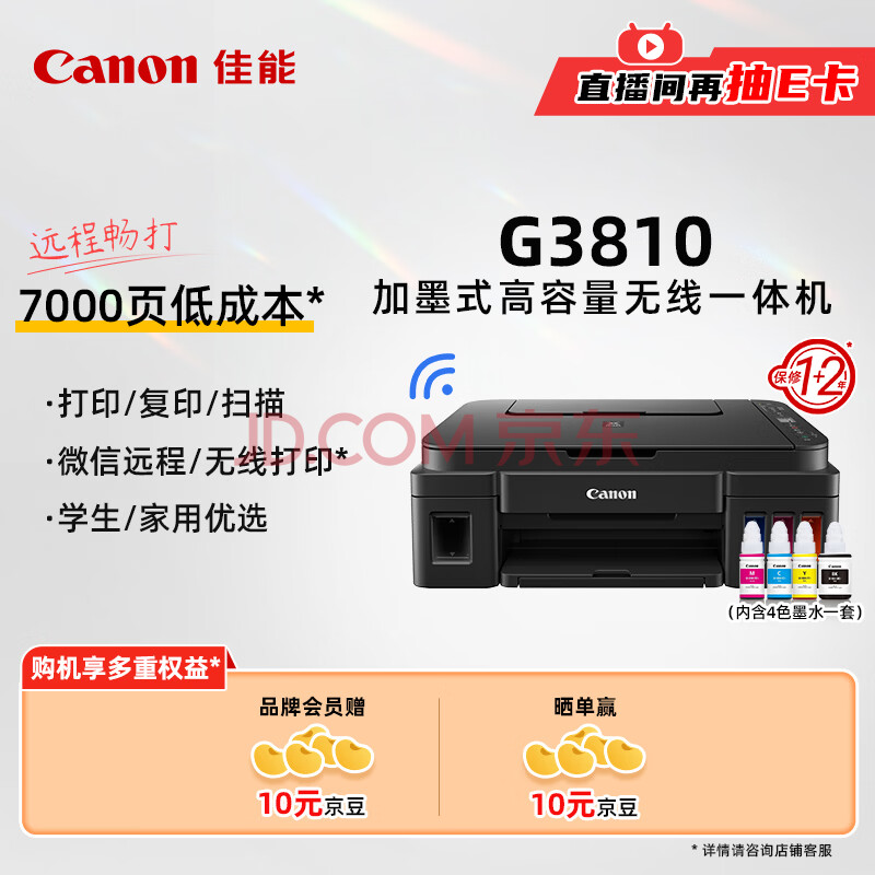 商品相册:佳能(Canon)G3810大容量可加墨彩色多功能无线一体机(打印/复印/扫描/作业打印/微信远程WiFi 学生/家用)第