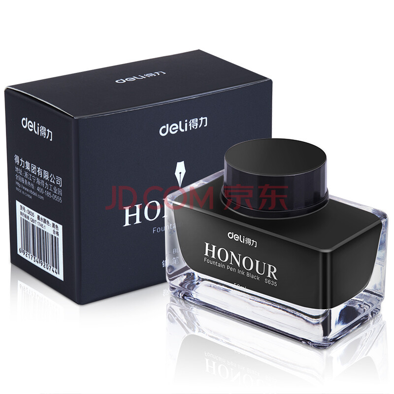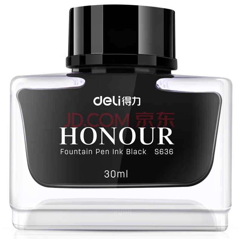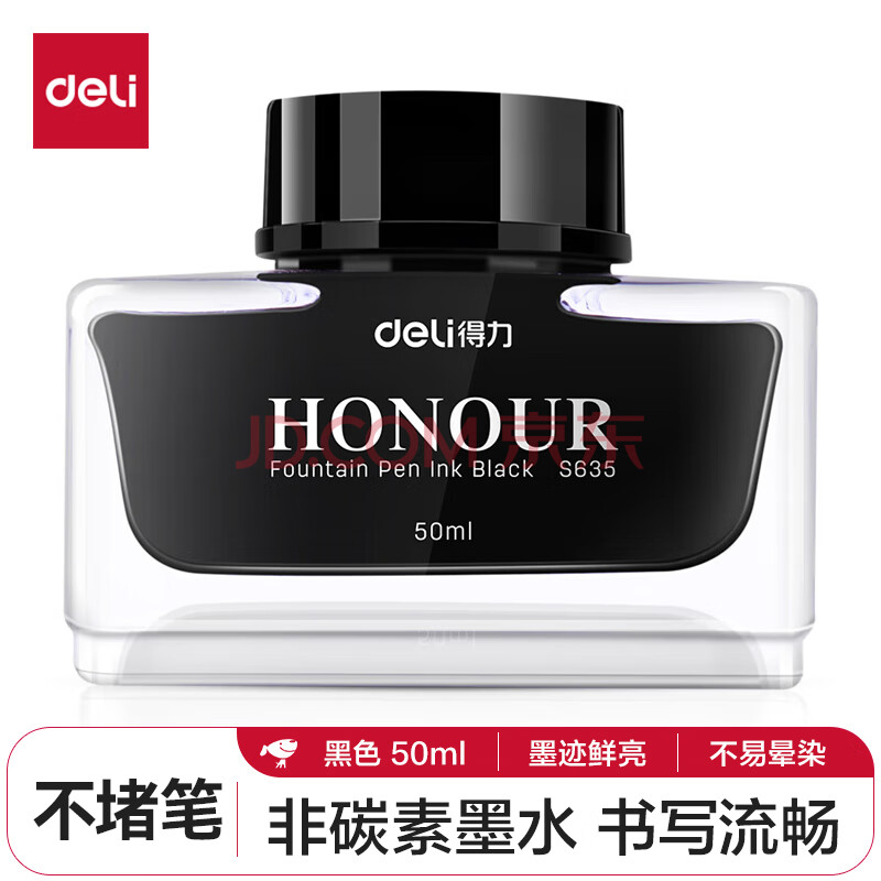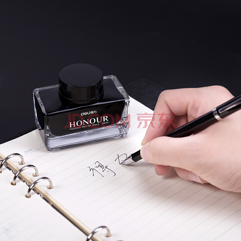 商品相册:得力(deli)钢笔墨水非碳素不堵笔 学生练字商务办公50ml黑色瓶装S635第