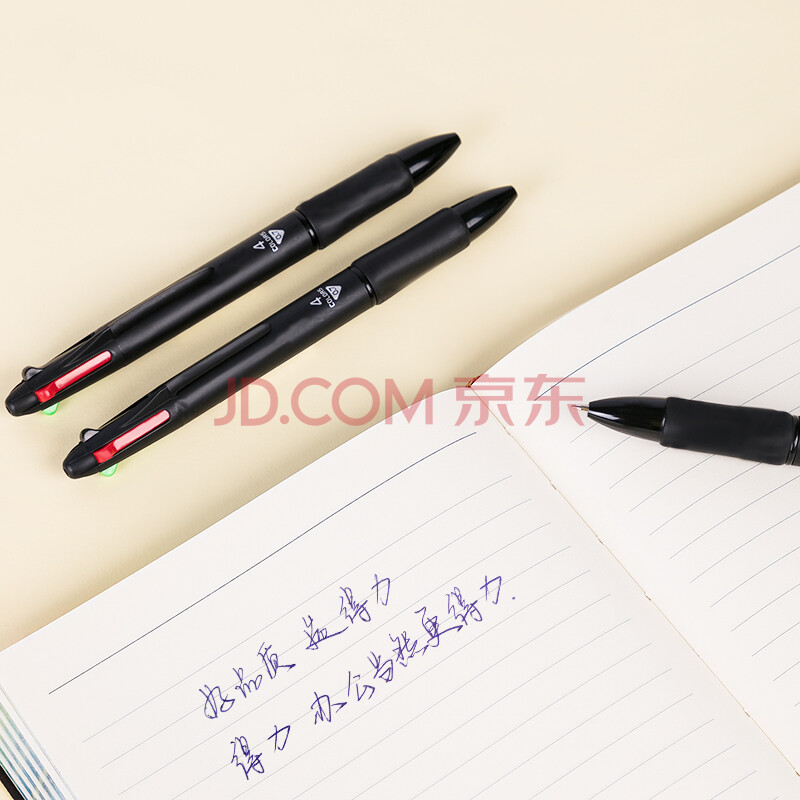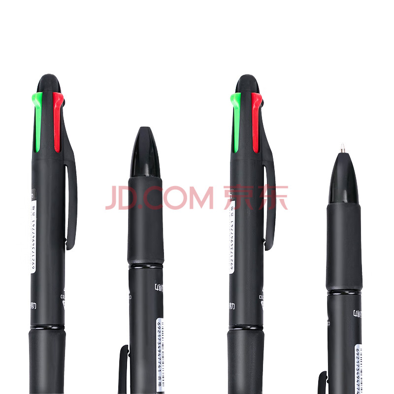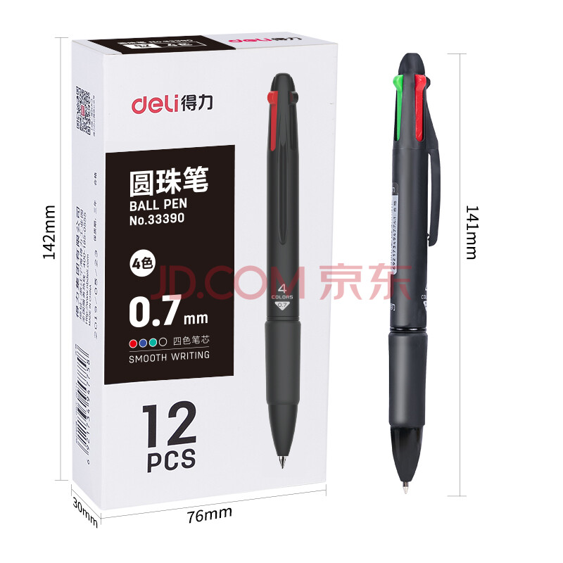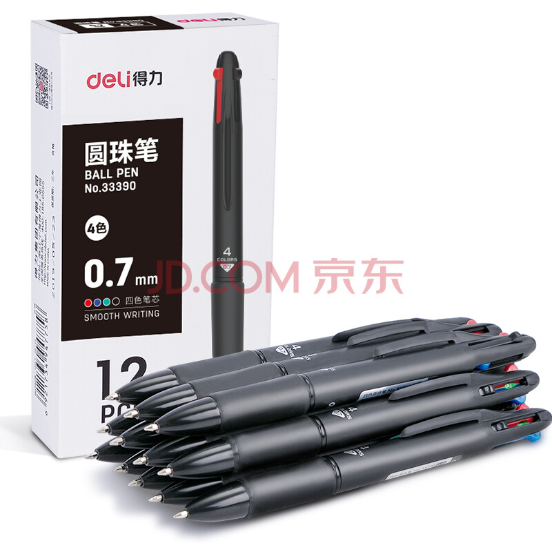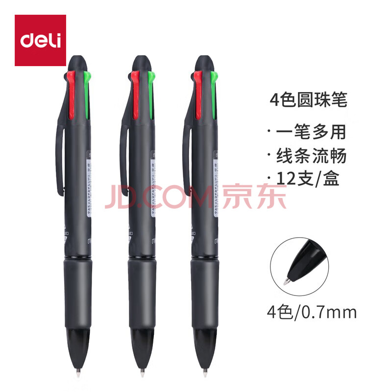 商品相册:得力(deli)多功能4色圆珠笔 0.7mm子弹头按动笔原子笔中油笔 (黑红蓝绿) 12支/盒 33390第