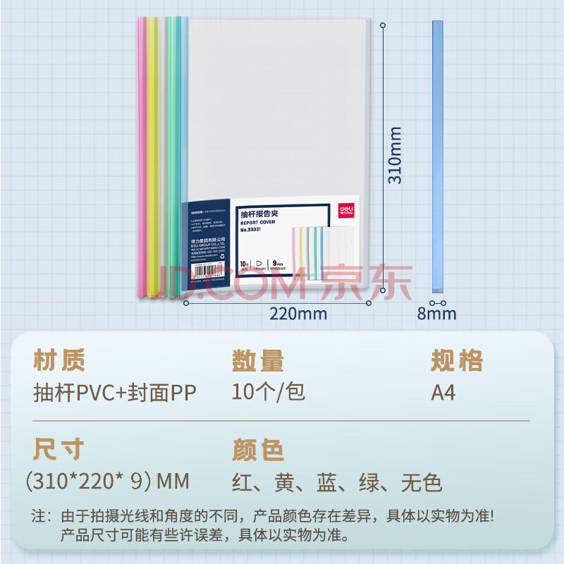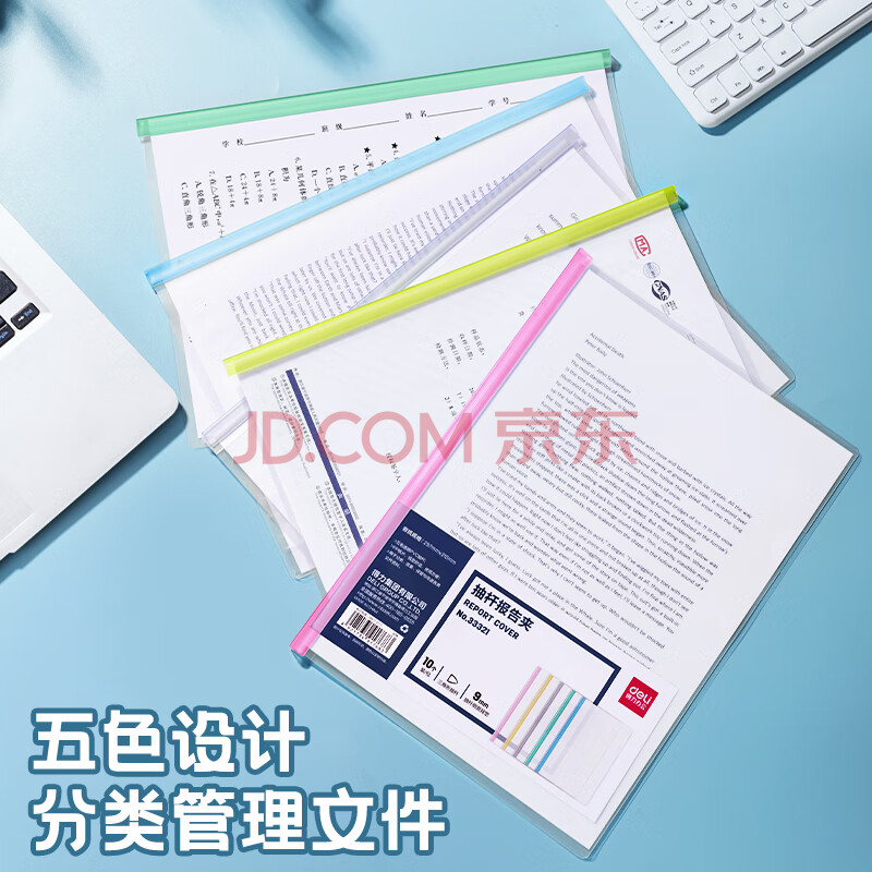 商品相册:得力(deli)10只A4透明拉杆夹 抽杆夹 文件夹资料夹学生考试产检报告资料收纳 5色装33321第