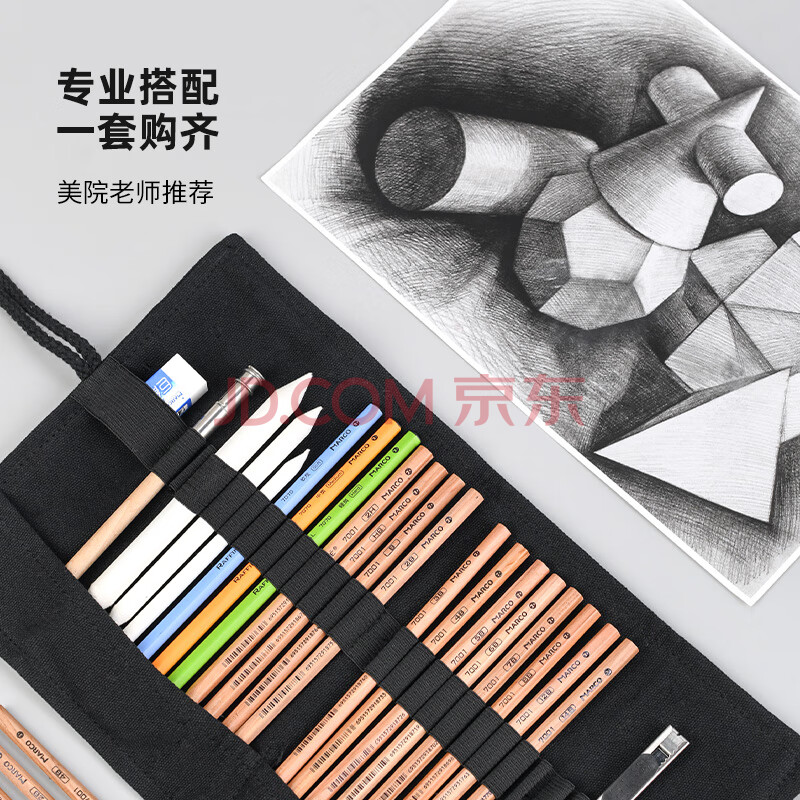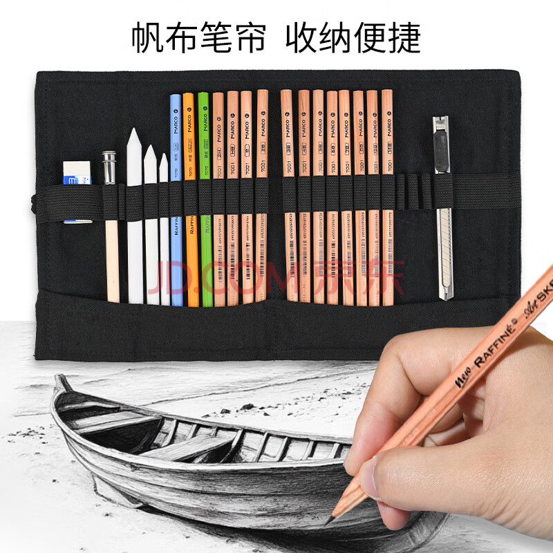 商品相册:马可(MARCO)素描铅笔22件套美术入门基础绘画套装炭笔便携帆布笔帘拉菲尼Raffine系列美术写生第1张/共9