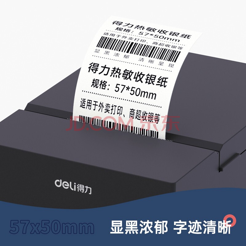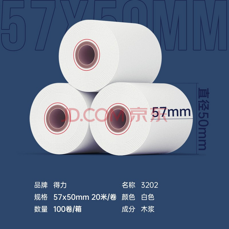 商品相册:得力(deli)57*50型20米*100卷 莱茵河热敏收银纸 京东美团外卖超市小票纸 3202【适配58mm机器 5801P等】第