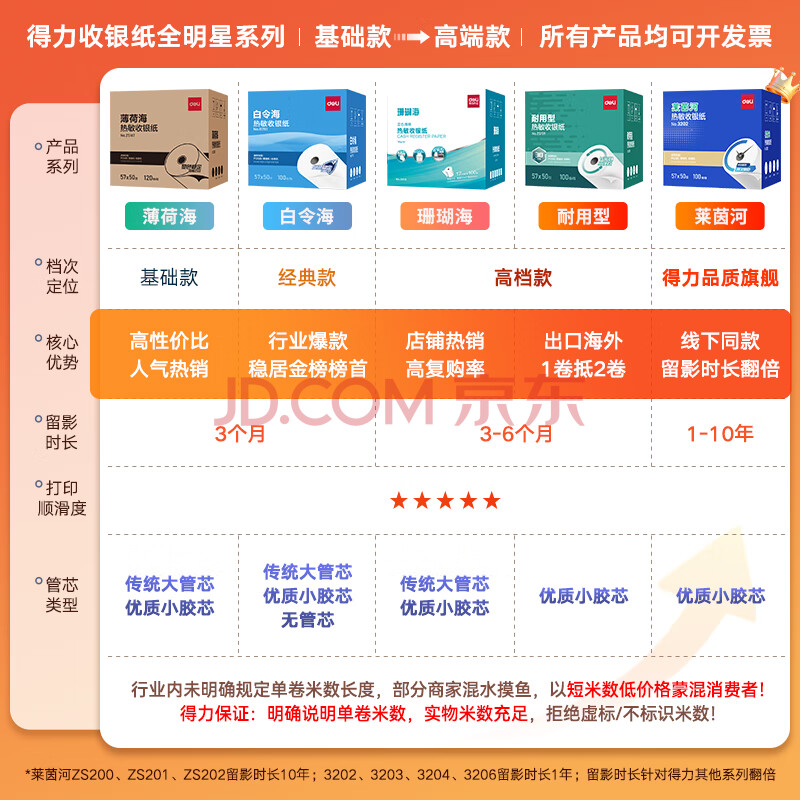 商品相册:得力(deli)80*60型28米*50卷 莱茵河热敏收银纸 京东外卖超市打印小票纸 3204【适配80mm机器 801P等】第