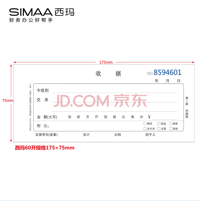 商品相册:西玛(SIMAA)10本装60k收据 三联单栏财务手写收据单175*75mm无碳复写自带垫板单本连号设计办公用品8014第