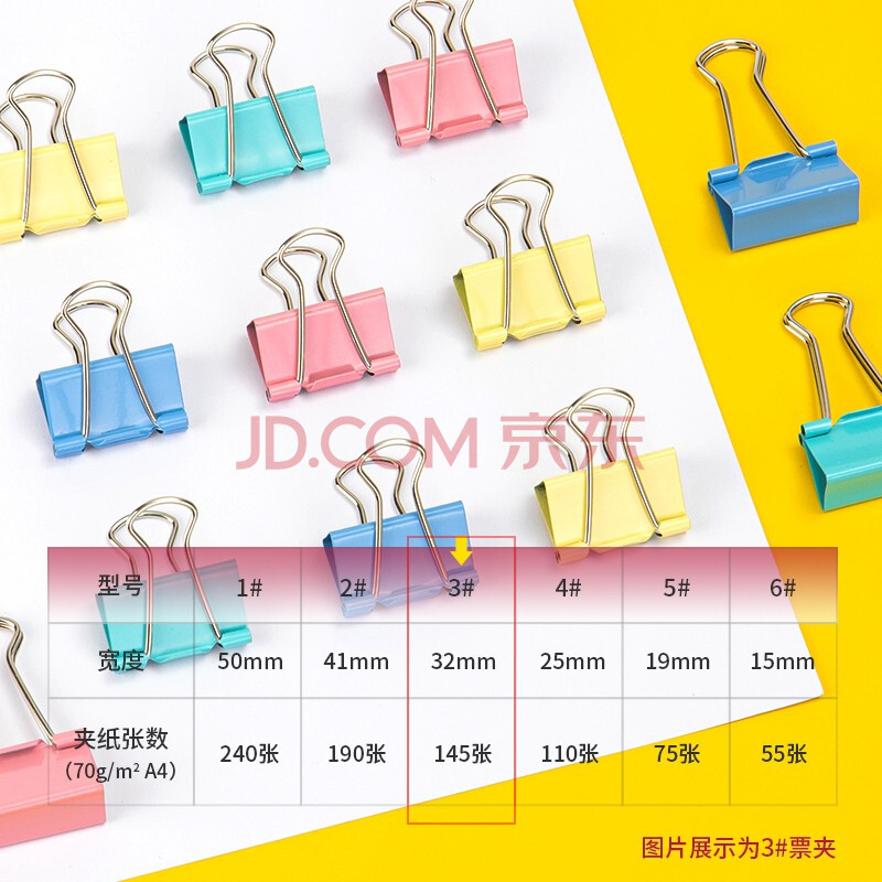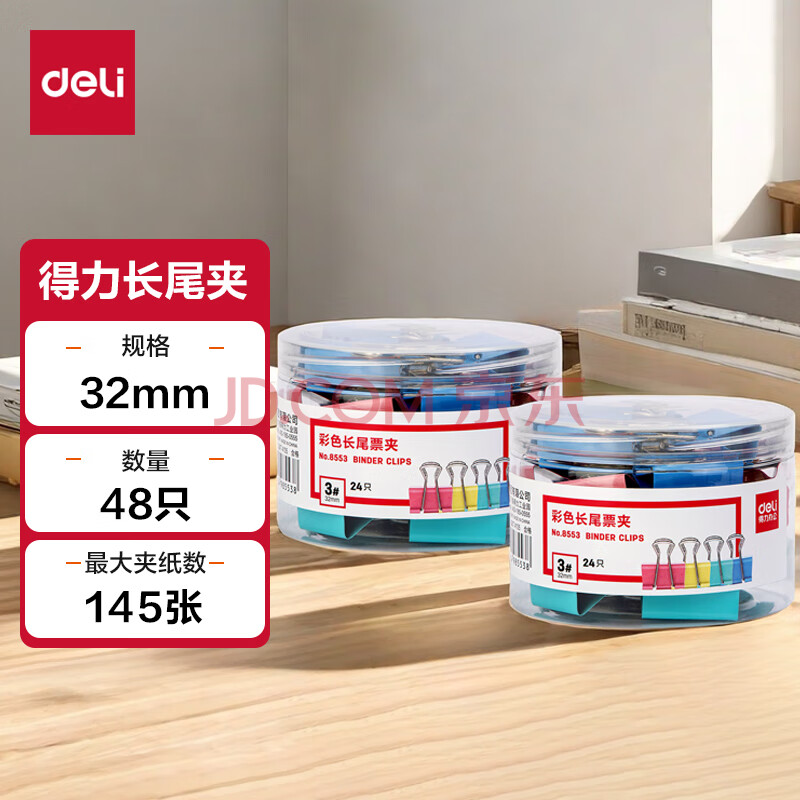 商品相册:得力(deli)48只32mm彩色长尾夹票夹 3#中号金属燕尾夹票据文件夹子 办公用品 24只/筒 33424第