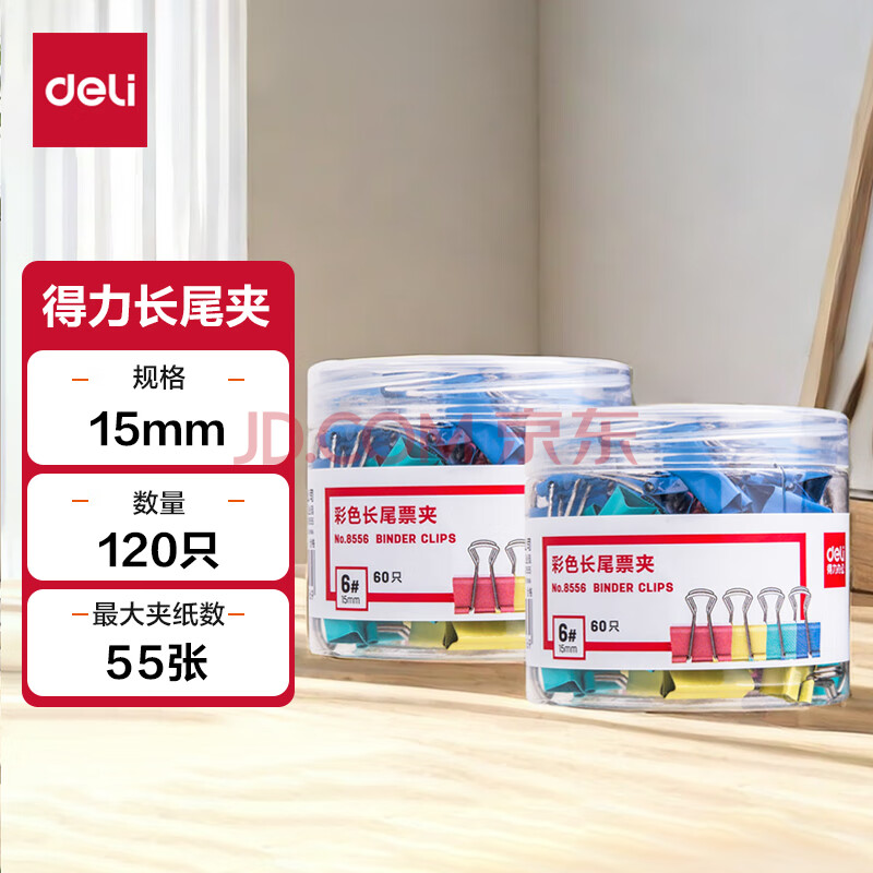 商品相册:得力(deli)120只15mm彩色长尾夹票夹 6#小号金属燕尾夹票据文件夹子 办公用品 60只/筒 33427第