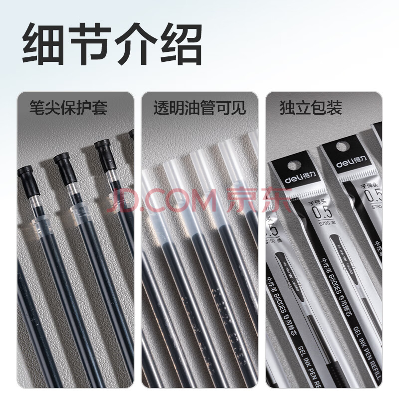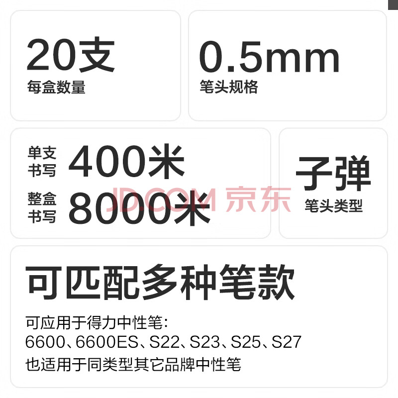 商品相册:得力(deli)拔帽中性笔芯替芯 0.5mm子弹头替芯 6600/33109/Q7适用 黑色20支/盒 S790第