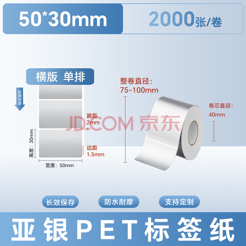商品相册:远平条码 亚银PET不干胶标签条码打印纸 横板单排50mm*30mm*2000张 支持定制第1张/共5