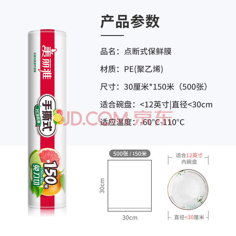 商品相册:美丽雅食品级保鲜膜150米*30cm 一次性断点大号免刀切耐高温可微波第