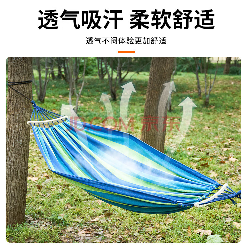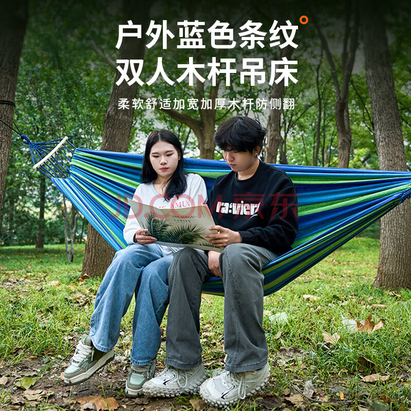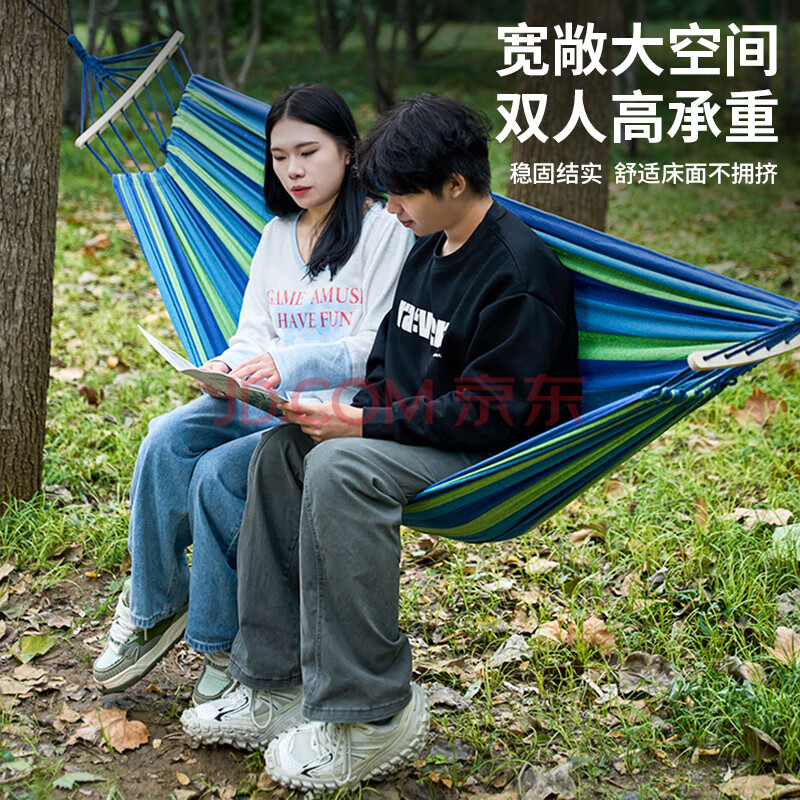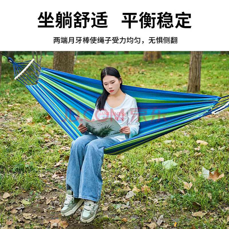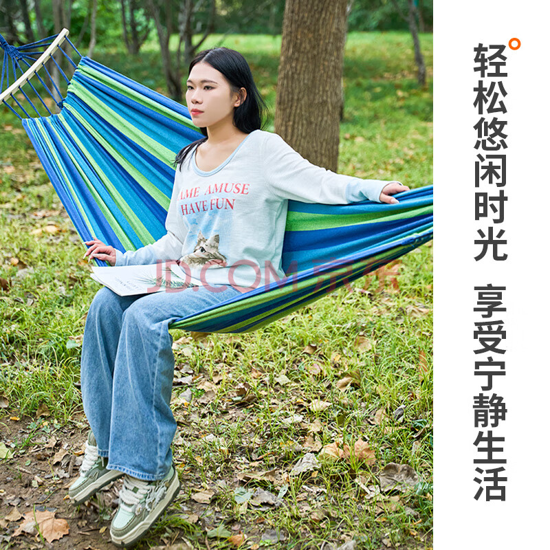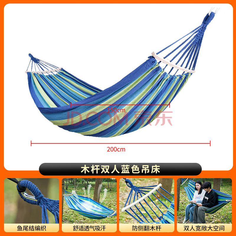 商品相册:尚烤佳(Suncojia)户外加厚加宽双人木杆防侧翻帆布彩条吊床 露营荡秋千第1张/共9