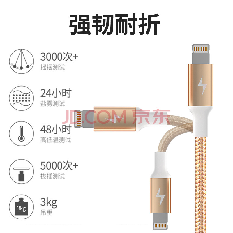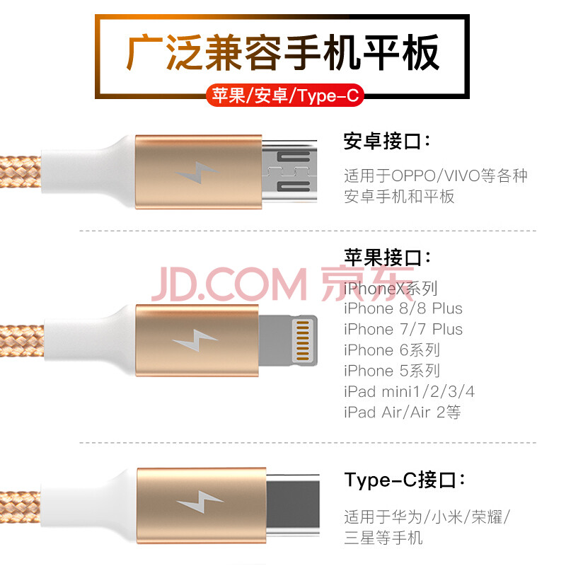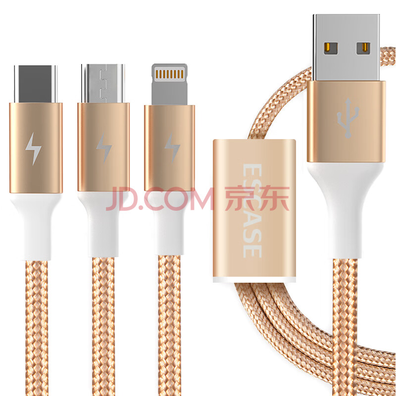 商品相册:ESCASE 数据线三合一Type-c安卓手机车载充电线快充适用iPhone14小米华为vivo一拖三C15S金色第1张/共5