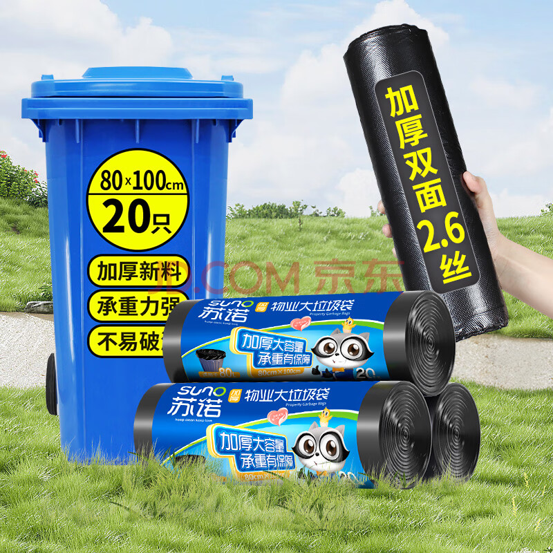 商品相册:苏诺平口式垃圾袋黑色80*100*cm20只单面1.3丝加厚大号物业塑料袋第