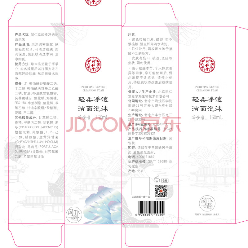 商品相册:同仁堂轻柔净透洁面泡沫150ml 氨基酸洗面深层清洁温和不紧绷元旦礼物第
