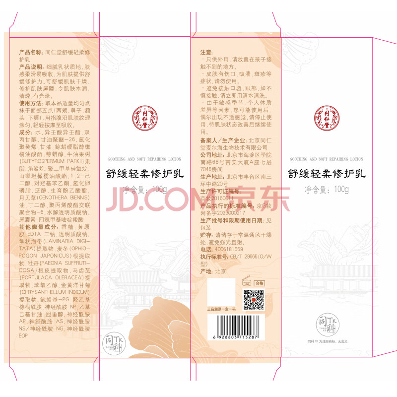商品相册:同仁堂舒缓轻柔修护乳100ml 敏感脆弱肌肤可用滋润补水保湿第