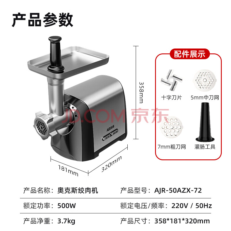 商品相册:奥克斯(AUX)绞肉机家用 灌肠机小型商用多功能电动不锈钢绞馅机切菜打蒜碎肉打肉机大功率灌香肠灌肉片肠机第