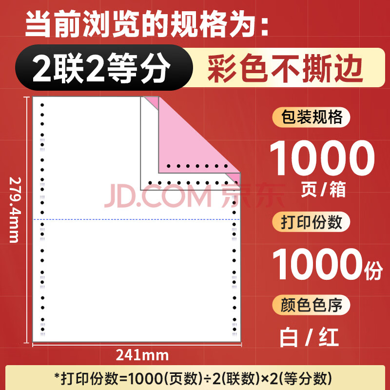 商品相册:天章 (TANGO)【缺页十倍赔】天章风二联二等分不撕边 针式电脑打印纸 出入库送货清单 1000页 241-2-1/2(白红)第