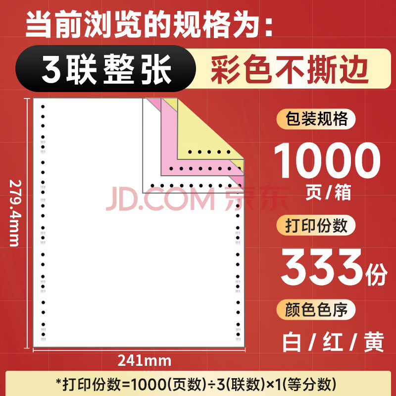 商品相册:天章 (TANGO)【缺页十倍赔】天章风三联整张针式打印纸 不撕边电脑打印纸 出入库送货清单1000页 241-3(白红黄)第