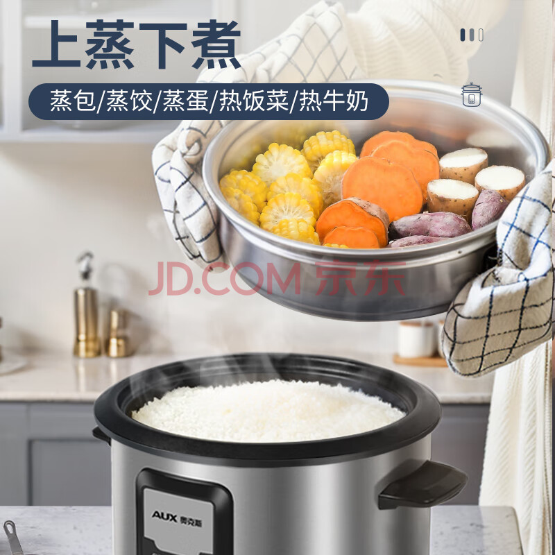 商品相册:奥克斯(AUX)电饭煲 电饭锅 老式直身带蒸笼 上蒸下煮老人适用 2-3人不锈钢家用小电饭锅 3升 WZA-0302第