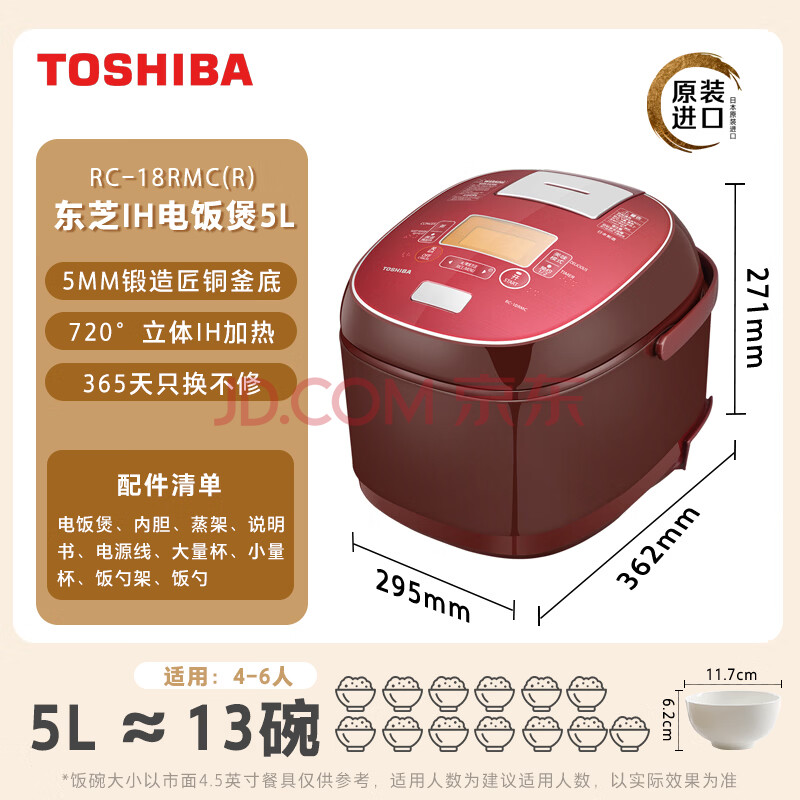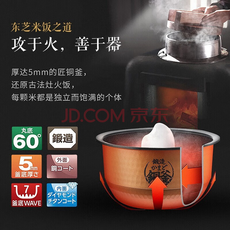 商品相册:东芝(TOSHIBA)电饭煲日本原装进口鲜饭煲5升IH多功能厚铜釜京东自营电饭锅家用煮饭锅 18RMC第