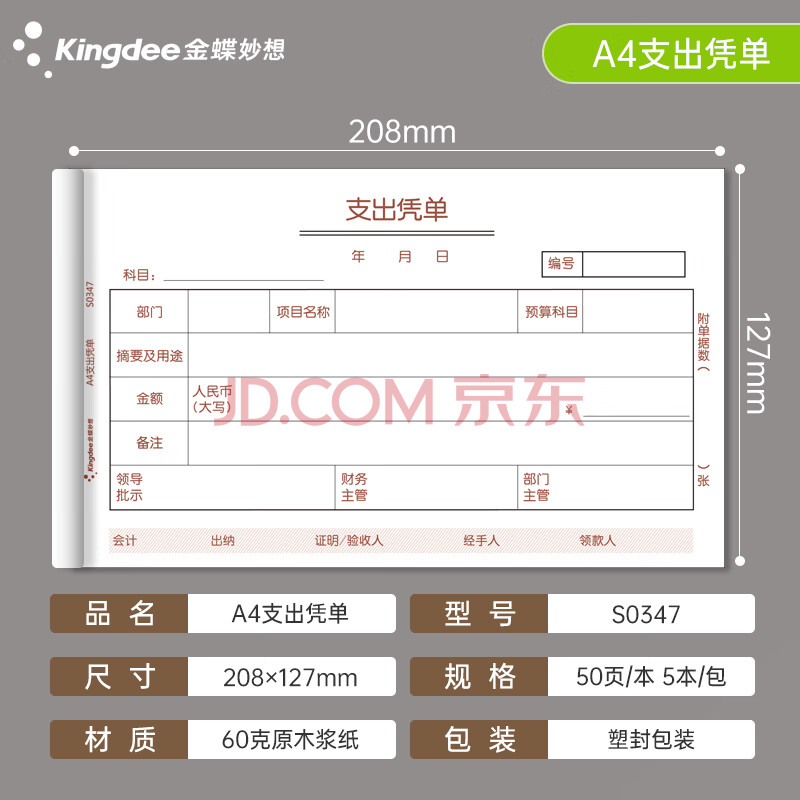 商品相册:金蝶(kingdee)支出凭单 财务手写报销单据 财会用品单据208*127mm 50张/本 5本/包第1张/共6