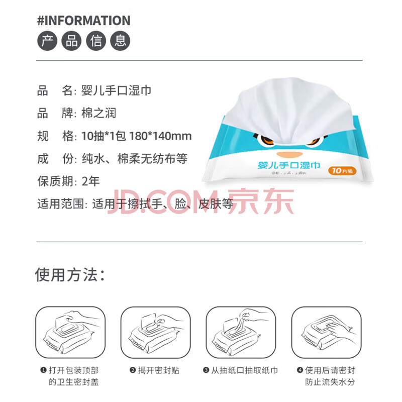 商品相册:棉之润 婴儿湿巾 10抽*1包 手口湿巾 一次性洗脸巾 小包便携装第