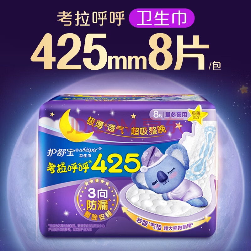 商品相册:护舒宝考拉呼呼超长夜用卫生巾超长夜用425mm8片姨妈巾京东自营官方旗舰第