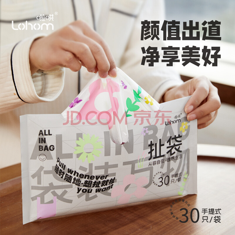 商品相册:啦哄扯袋车载背心垃圾袋花色37*42cm60只1.8丝手提汽车旅行加厚车用第