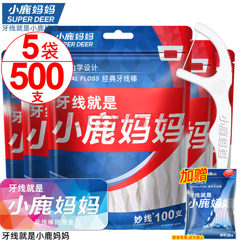 商品相册:小鹿妈妈 经典牙线棒舒适深洁牙线牙签100支/袋*5袋共500支随身盒方便携带第1张/共9