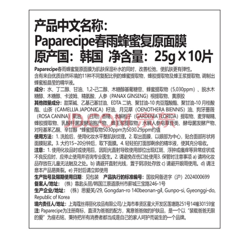 商品相册:春雨(Papa recipe)红参蜂蜜精油补水面膜10片 深度锁水 淡化细纹送女友礼物第