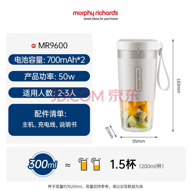商品相册:摩飞电器(Morphyrichards)榨汁机现榨鲜喝 便携式榨汁杯 磁吸充电大容量电池迷你无线果汁机 料理机小体重随行杯 MR9600白色第1张/共8
