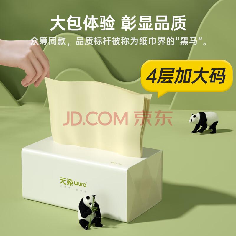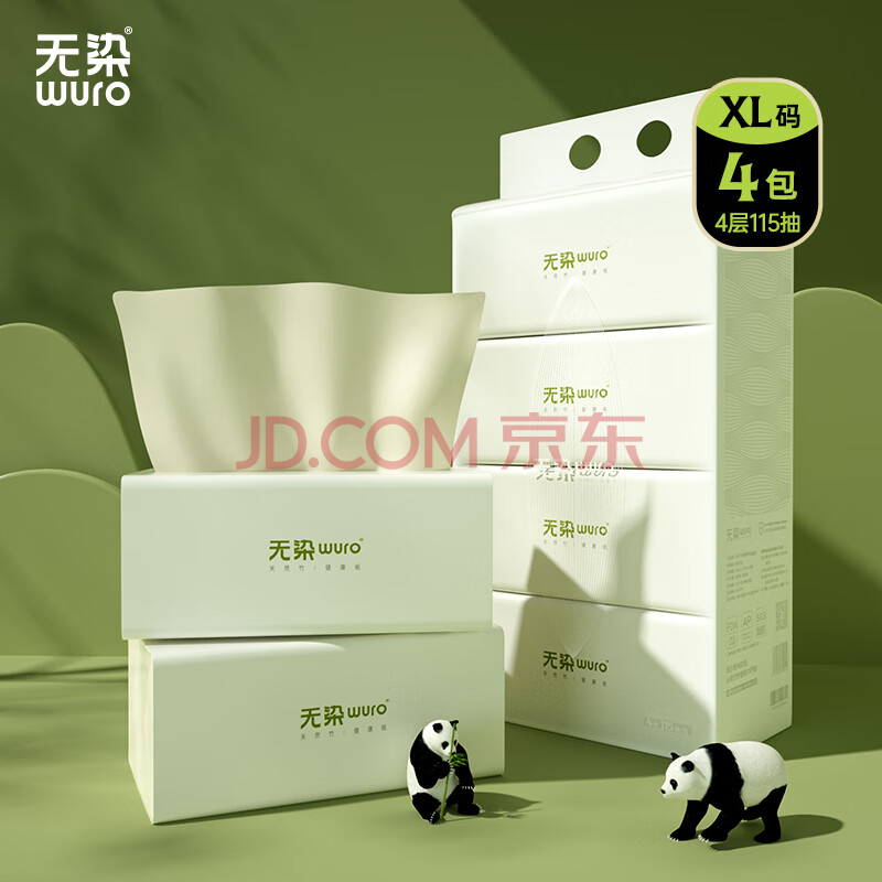 商品相册:无染wuro本色抽纸 竹浆纸4层115抽*4包XL码 加厚大尺寸 卫生纸巾餐巾纸第