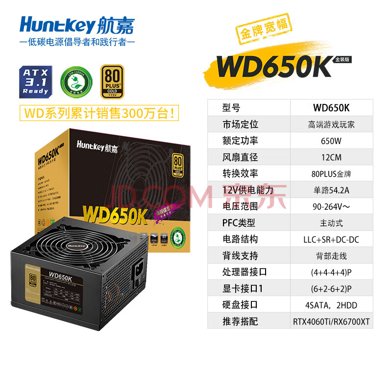 商品相册:航嘉(Huntkey)WD650K 金牌650W电脑电源(80PLUS金牌/单路50A/全电压/LLC+SR+DC-DC/智能温控/3A大作)第