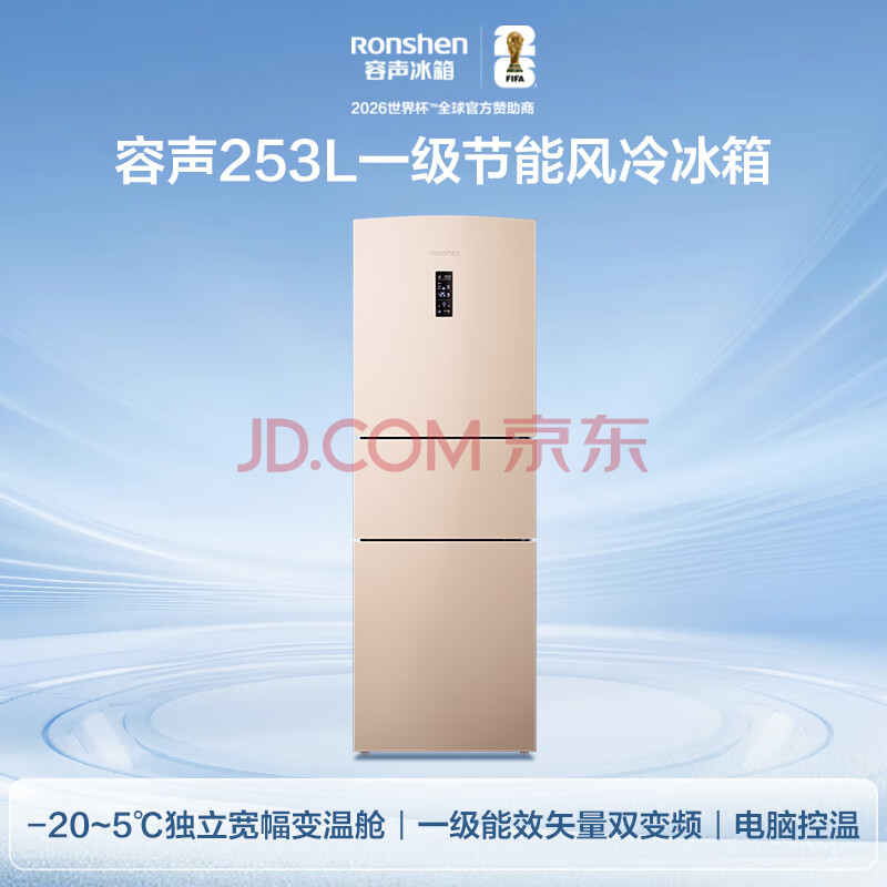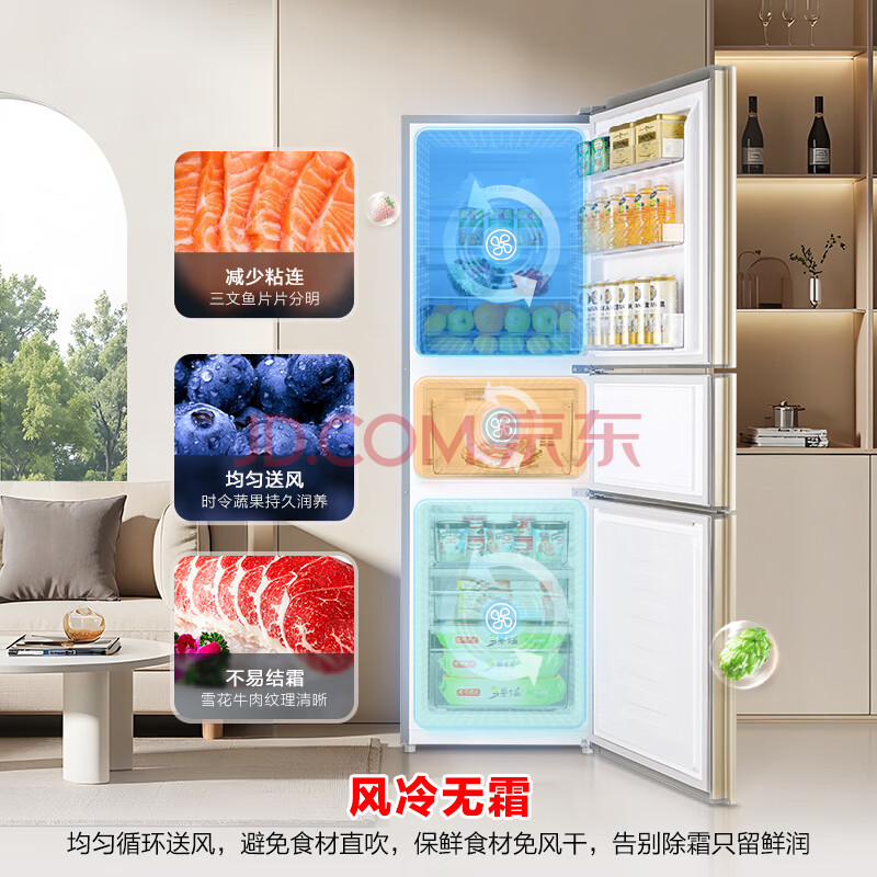 商品相册:容声253L三开门小冰箱小型家用超薄一级能效风冷无霜变频小户型璀璨金BCD-253WD16NPA第