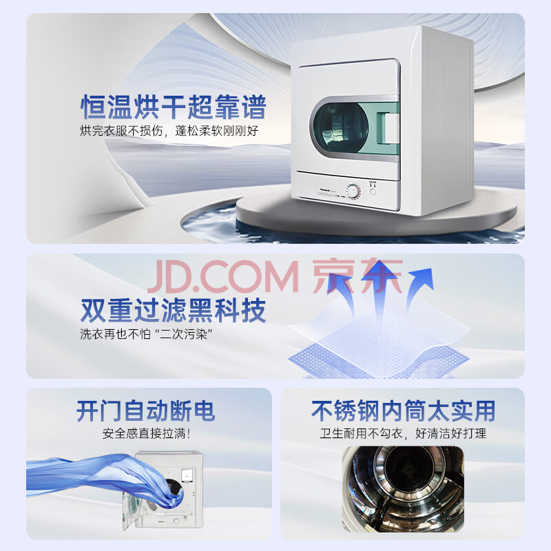 商品相册:松下(Panasonic)烘干机 4.5KG 全自动 迷你 小型 家用 母婴干衣机 双重过滤线屑 恒温烘干 NH45-19T第1张/共8