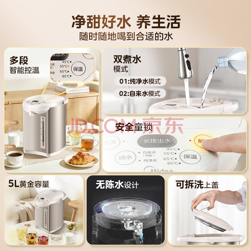 商品相册:美的(Midea)电热水瓶电热水壶全自动断电保温控温恒温食品级304不锈钢5L大容量家用泡茶母婴冲奶神器Colour201第1张/共8