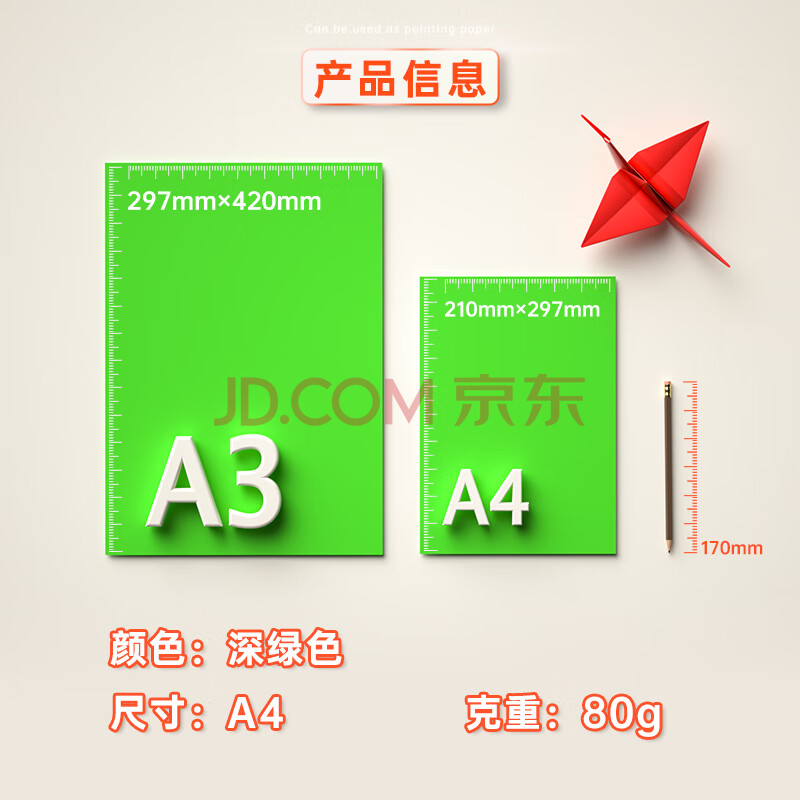 商品相册:得力(deli)A4 80g深绿复印纸 彩色打印纸 儿童手工折纸剪纸彩纸 非硬卡纸 100张/包 7757【经典热销】第