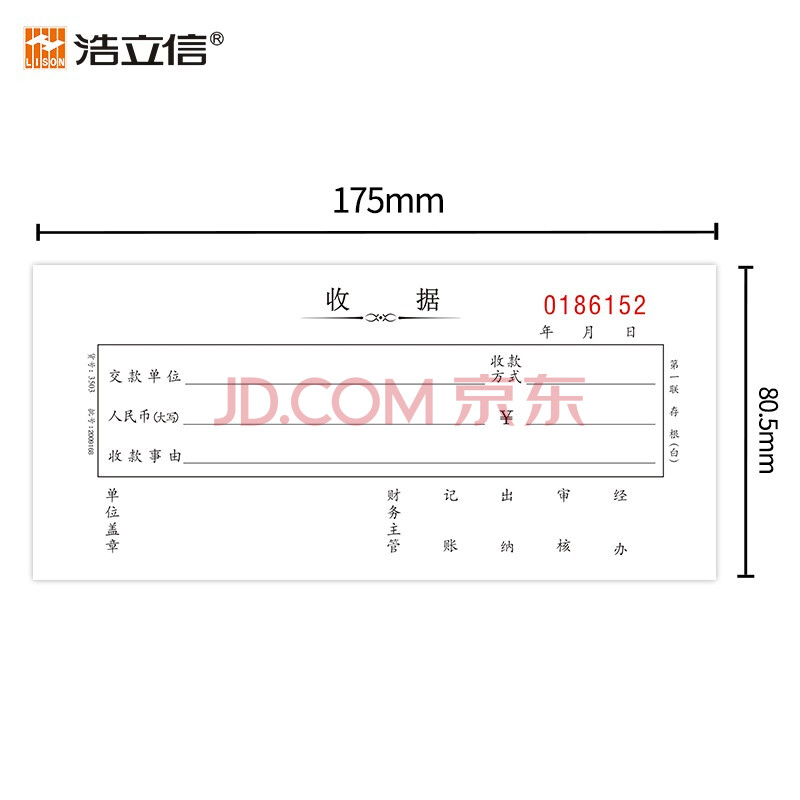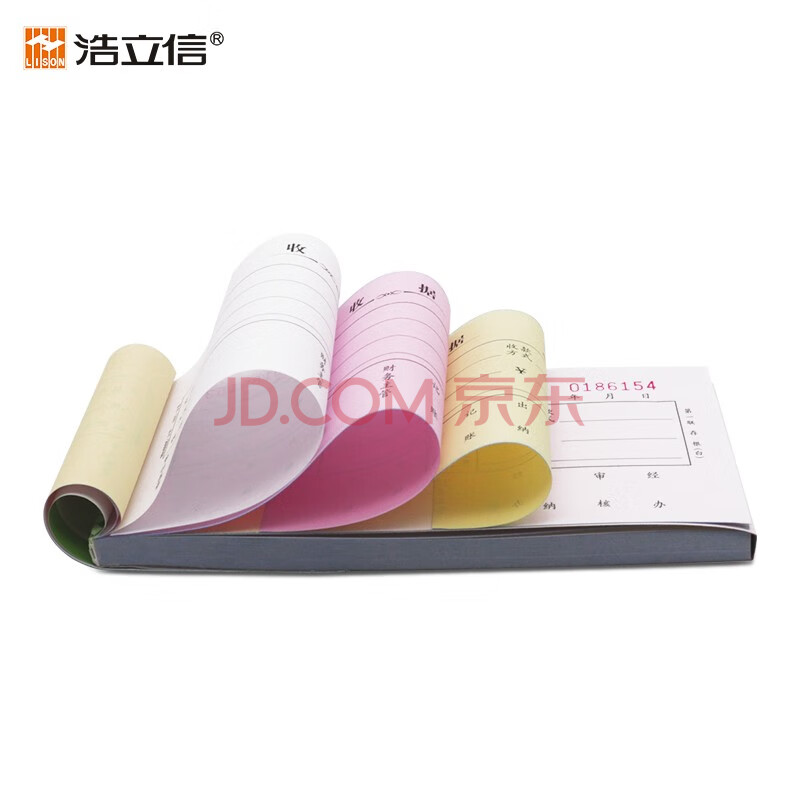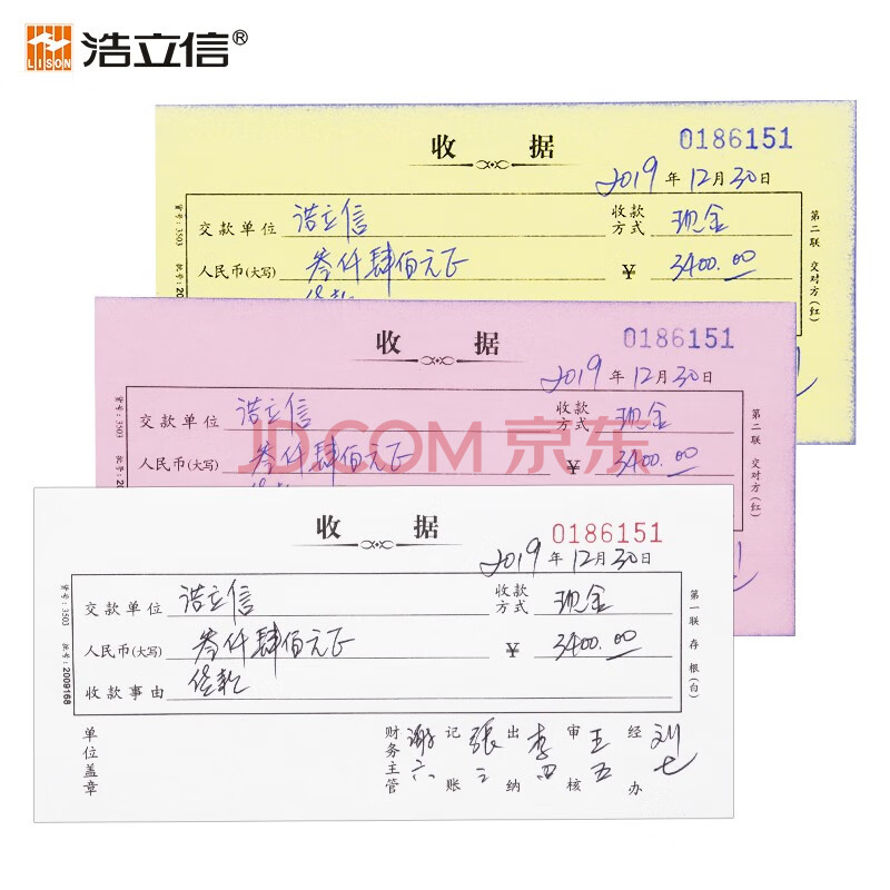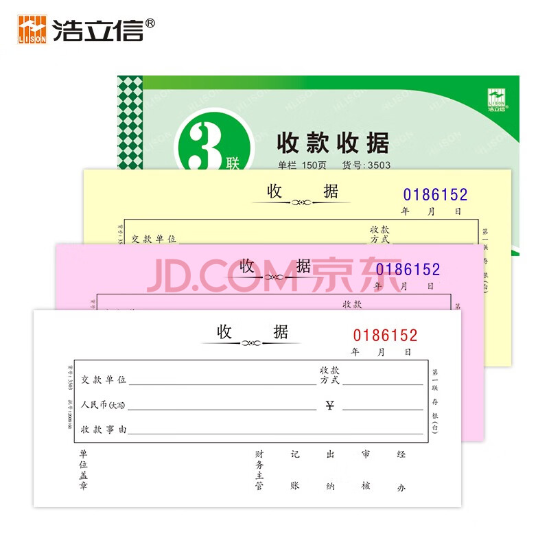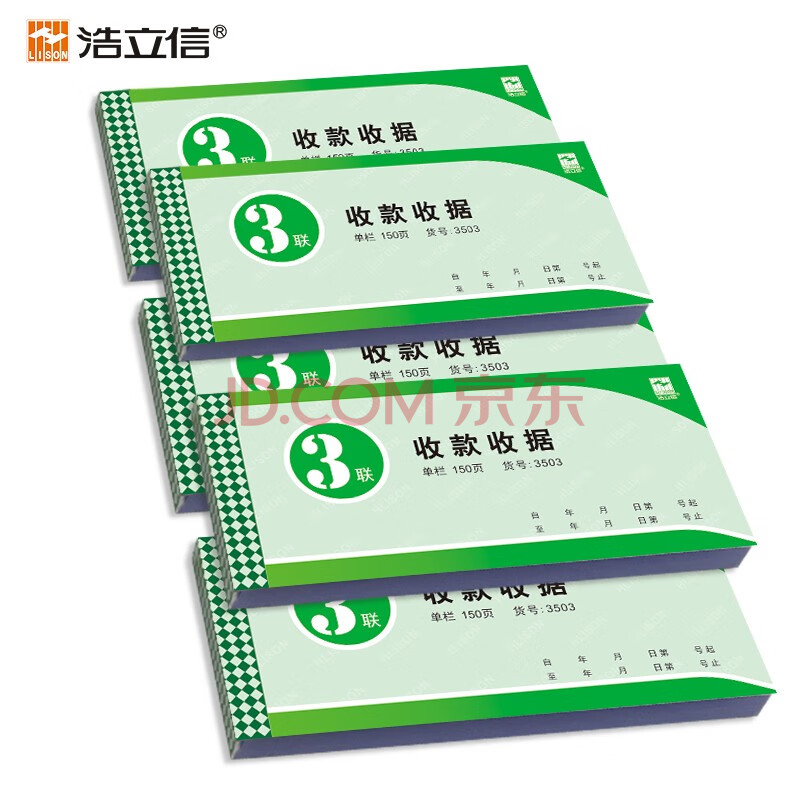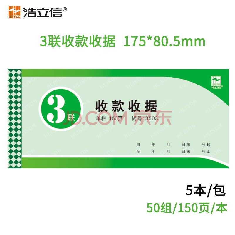 商品相册:浩立信(LISON)3503-54K 175*80.5 5本/包 50组三联单栏收据 百万位 财务手写收款收据单 无碳原纸 自带垫板第