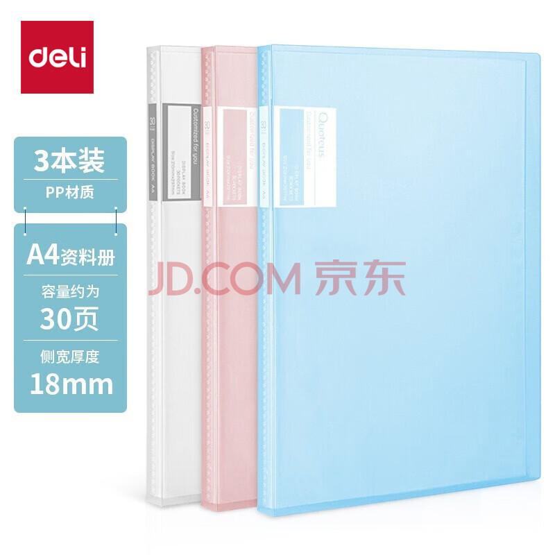 商品相册:得力(deli)A4/30页淡彩资料册 学生试卷文件夹奖状收集册产检报告孕检收纳册 办公文件保护 3只混色装 27151第