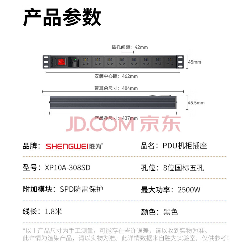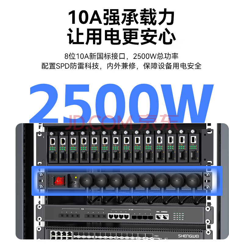商品相册:胜为(shengwei)PDU机柜插座 8位10A总控防雷保护国标工程机房机柜专用多功能插座插排接线板XP10A-308SD第