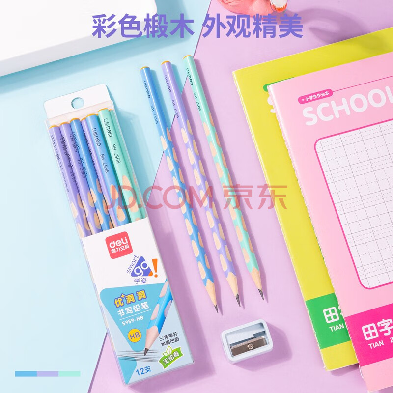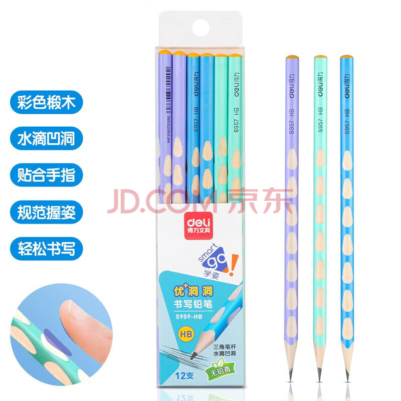 商品相册:得力(deli)洞洞笔铅笔12支HB马卡龙色三角杆书写铅笔易抓握儿童矫姿铅笔学生S959-HB学生开学文具第