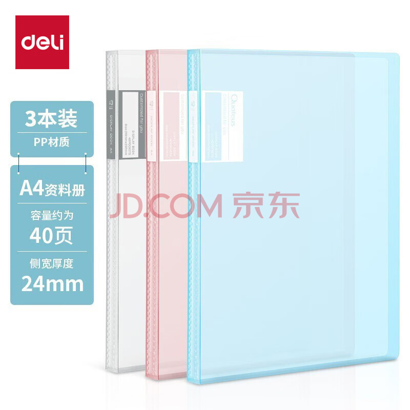 商品相册:得力(deli)A4/40页淡彩资料册文件夹 学生奖状收集册产检报告孕检资料收纳册 时尚简约大容量3只混色装 27152第